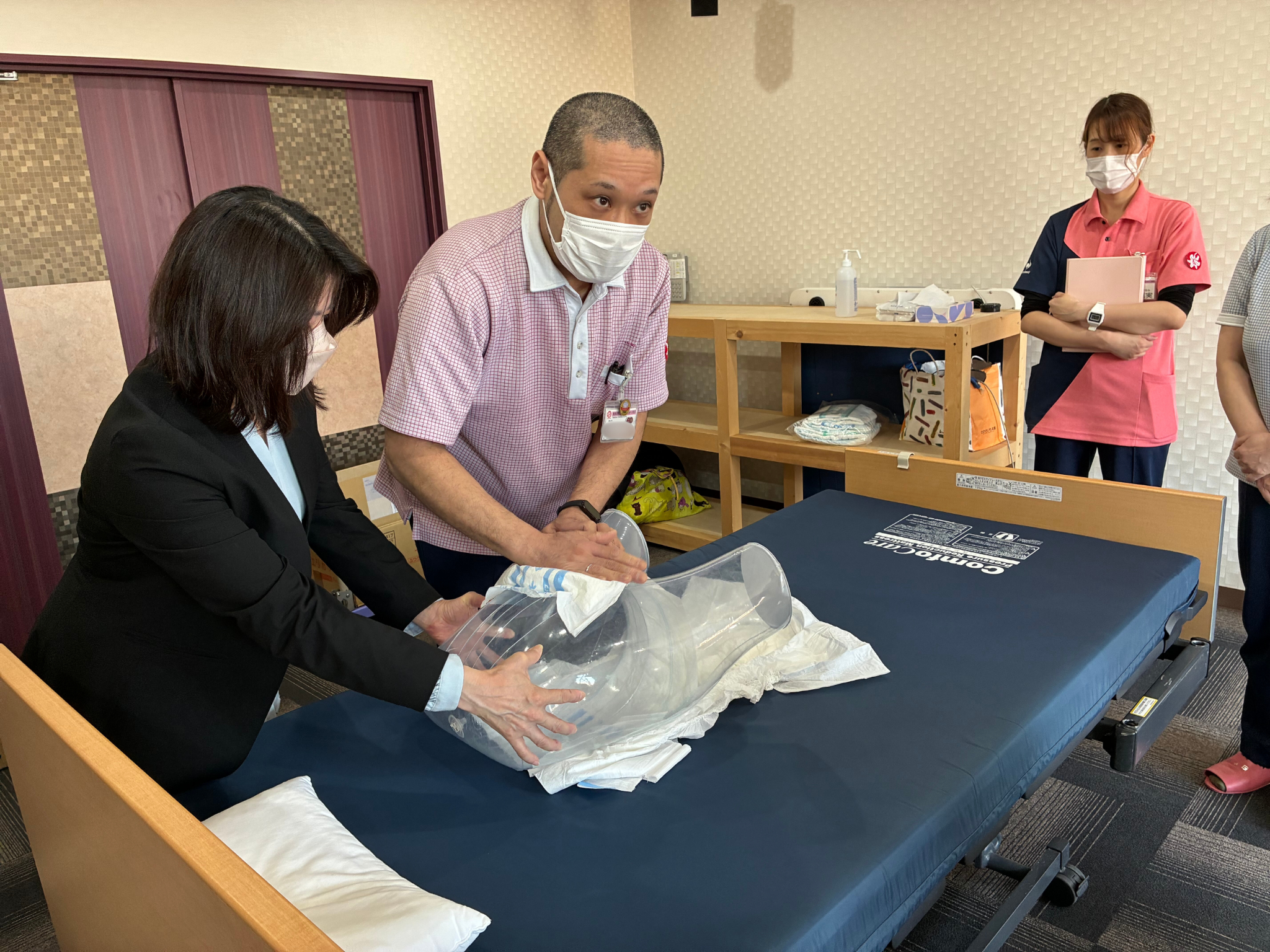 新卒職員が“利用者様役”となり、オムツマイスターがオムツを装着、その後、大王製紙のアドバイザーがその技術を確認します。