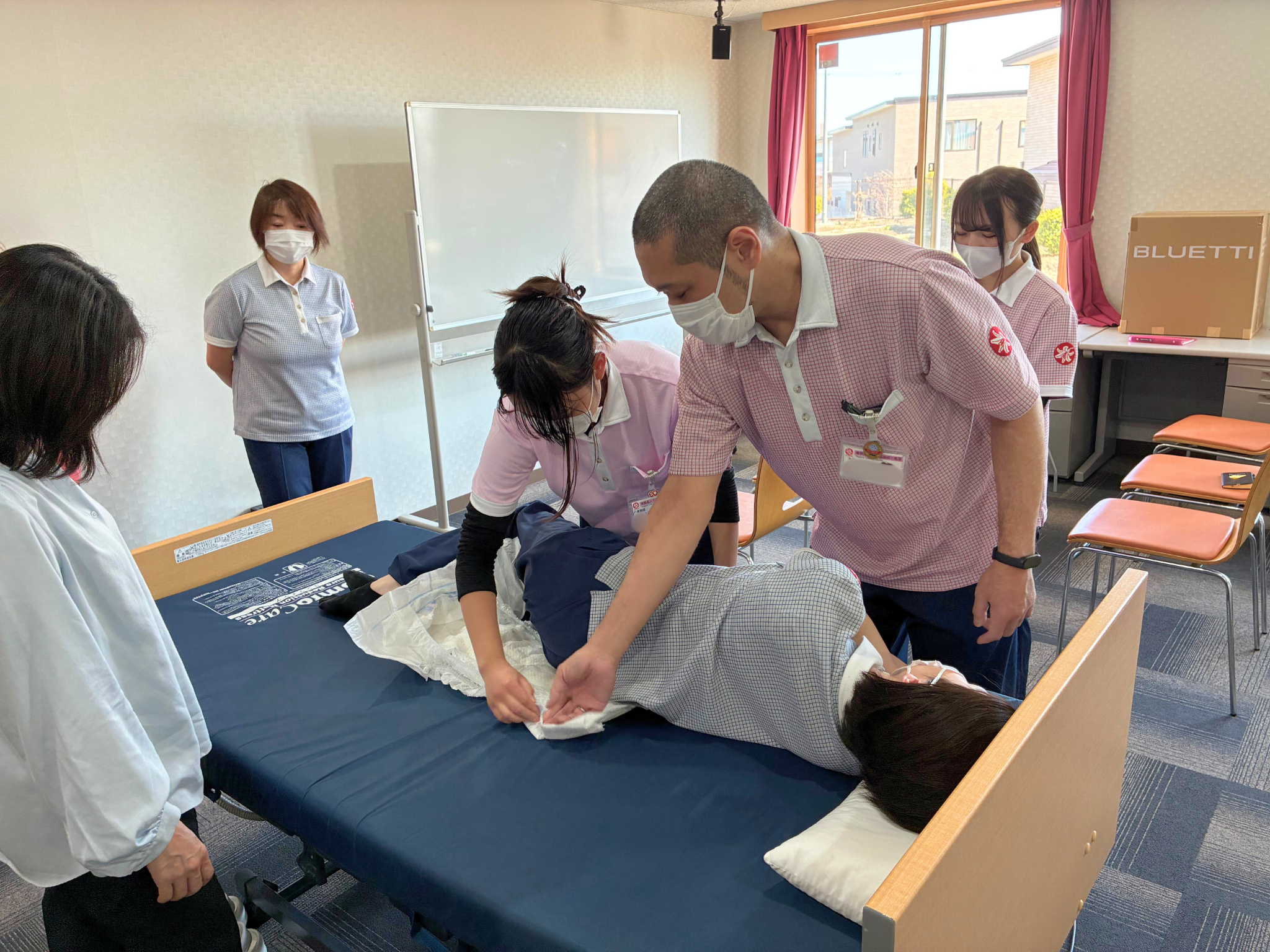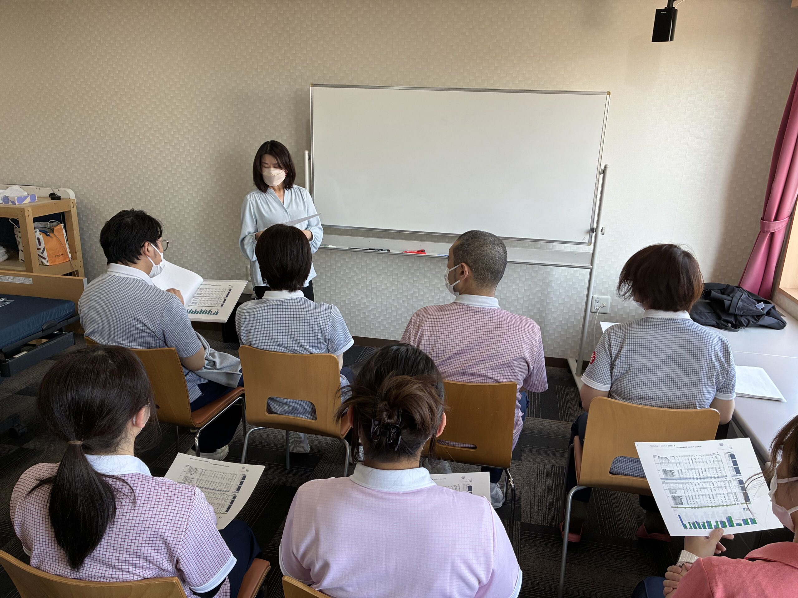 参加者は、白ゆりグループ内で資格を持つオムツマイスター3名のほか、今年4月に入職した新卒介護職員2名、施設内の訪問看護師1名も見学し、実技と講義の両面からしっかりと学べる研修となりました。