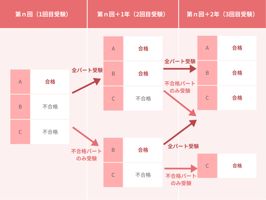 - 初回は、A・B・Cの全パートを受験し、合格したパートは翌年・翌々年まで試験を免除